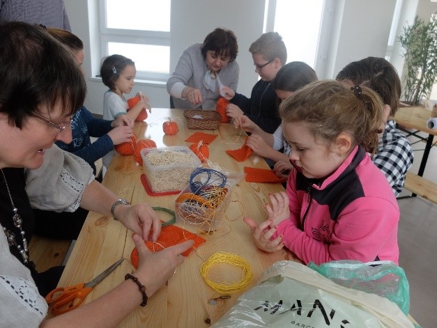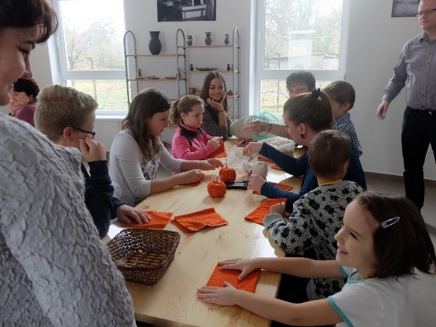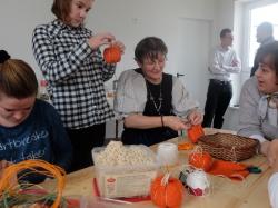 A gyerekek Gyöngyi néni vezetésével kézműves foglalkozáson vehettek rész ahol, saját maguk készíthettek textil munkákat: az ősz jegyében textil tököket.